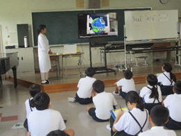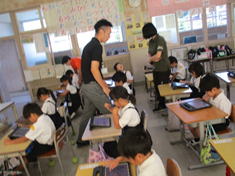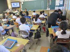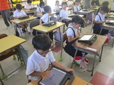 今日は秋の気配を感じさせるさわやかな風が吹き、勉強に最適な気温でした。子ども達が学校で使用しているタブレット端末の中に、学年に応じた各教科のドリル形式の問題アプリ(eラインズライブラリ)が入っています。その問題には子ども達がログインして、難易度なども自分用に変更でき、自分が納得いくまで繰り返し問題が解けるようになっています。そのアプリの使い方を業者の方に来ていただき、子ども達にわかりやすく教えていただきました。子ども達は楽しみながら問題を解いていました。