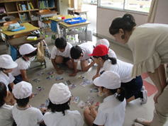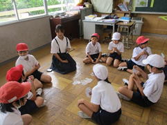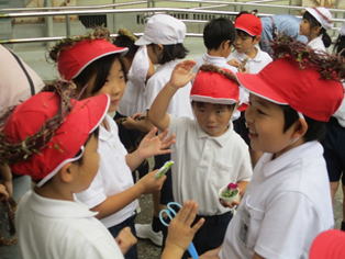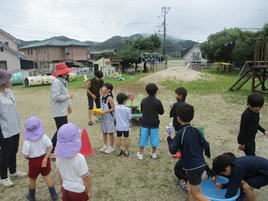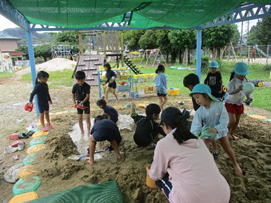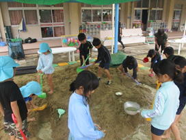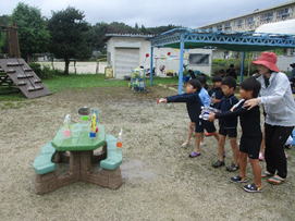 2時間目に1年生はお隣の幼稚園にお邪魔しました。水着に着替えて手にはペットボトルや水鉄砲があり、ニコニコしながら園児と対面。先生から遊ぶ時の約束事を確認したら、園児と一緒に遊びがスタート。水鉄砲でペットボトルの的を当てて倒したり、砂場で穴を掘って水を入れたりして園児たちと楽しく遊びました。