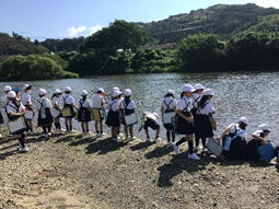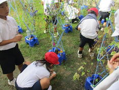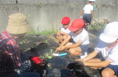 午後から地域の方と一緒に「田植え」を5年生が体験しました。地域の方からお借りしている田んぼに行くと、田植えがしやすいように田の中に格子状の線が引いてありました。地域の方が事前に作業してくださっていました。子ども達は裸足で田んぼに入り、稲を植えていきます。初めは恐る恐る田んぼに入り、なかなか前に進まなかったのですが、田植えが進んでいくにつれて本気になって植えていました。やよい幼稚園の園児も応援してくれる中、足が田んぼに取られて思うように動けず、慌てる子もいました。最後は川で足を洗って、地域の方に「ありがとうございました」と全員で大きな声でお礼を言って学校に戻りました。今、お米不足が深刻な問題となっています。とても貴重な体験を地域の方に与えていただき、本当にありがたいです。これからも、子ども達で稲の成長をしっかりと見守りながら、お米についての学習を深めていく予定です。