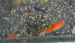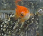 給食当番が給食を持って行ったあと、玄関に置いてある水槽の中の金魚をのぞいてみると、金魚たちもお腹がすいたと口をパクパクさせていました。これまでは1匹しかいなかった金魚も、先月から小さな金魚3匹も仲間入りして、にぎやかな水槽になっています。