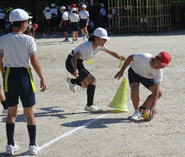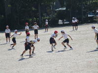 5校時にはグラウンドで5年生が体育の授業「タグラグビー」を行っていました。ラグビーと同じルールでボールを後か真横に投げて、味方にパスしてトライを狙いますが、タックルや身体接触はせずにボールを持っている選手のタグを取ると攻守が入れ替わります。見ていてスピード感があり、瞬発力と判断力が必要な競技です。トライを決めると子ども達は大喜び。元気で体を動かすことが大好きな5年生は、タグラグビーに燃えています。
