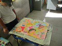 そして、誰もいないそれぞれの教室では、子ども達が図工の時間で描いた作品が掲示してありました。とても楽しそうな絵で、教室を明るくしてくれています。2年生は「すきなものな~に」という題で、クレヨンで楽しく描いていました。3,4年生は色塗りでいろいろな色を使って、自分なりに工夫していました。これからの作品制作がとても楽しみです。