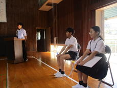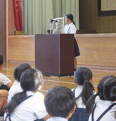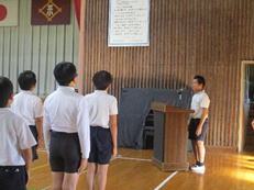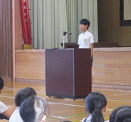 始業式の後半は10月18日()に大和コミュニティセンターで開催される第15回伊藤公カップ英語スピーチコンテストに出場する6年生2名が、全校児童の前でスピーチを披露しました。少し緊張している感じもありましたが、2人ともよく練習していて、これからの仕上げで更に上手に表現できるようになるでしょう。出場する2名の6年生を全校児童で応援しています。本番もがんばってくださいね!!
