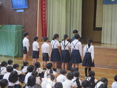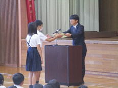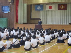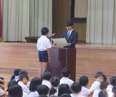 朝、体育館で前期終業式を行いました。光市民憲章をみんなで唱和し、私から各学年のがんばったことやいいところを伝え、前期のがんばりを全校で讃え合いました。その後、表彰式を行い、光市通信水泳記録会、光市読書感想文コンクール、光市科学展、光市環境保全標語コンクール、よい歯のコンクールで賞に入った児童を表彰しました。入賞した児童は全員、自分の名前を呼ばれてその場に立ち、「はい。」と大きな声で気持ちのよい返事をしていました。その後、代表児童が賞状を受け取り、他の児童からあたたかい拍手が送られました。とても多くの児童が文化面や体育面で表彰されました。