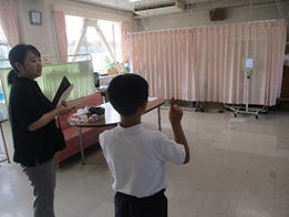 今日の午前中、保健室では視力検査を行いました。子ども達は廊下に並んで、保健室の先生から検査方法の説明を聞きました。遮眼子(しゃがんし)で目を隠して、片方の目で視力検査表を見ていきます。スマートフォンやゲームのし過ぎなどで視力低下が心配されていますが、これからも健康診断を通じて目を含めて子ども達が健康で健やかに成長できるように支援していきたいと思います。