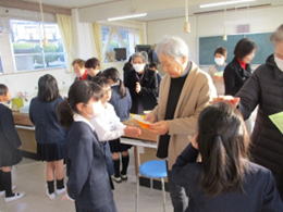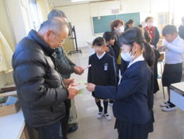 今日は今年最後のおはよう計算プロジェクトだったので、全校児童の代表として3年生の子ども達から地域の先生へ「ありがとうメッセージカード」を手渡ししました。地域の方はとっても喜んでおられ、子ども達もうれしくて笑顔いっぱいの時間になりました。