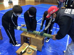 今日の2校時、4年生は体育館で森林体験学習を行いました。光市林業組合の方々が講師として来られ、木の大切さを伝えられました。そして、竹を使って一輪挿しを作るために道具の使い方や手順を教えていただき、木工に挑戦しました。竹をのこぎりで切ったり、竹割ナタを使ったりと友達同士で手伝いながら、無事に完成しました。子ども達はとても充実した表情と、もっと作ってみたいと思ったようでした。光市林業組合の皆さま、子ども達に竹の素晴らしさとモノづくりのおもしろさを教えていただき、ありがとうございました。