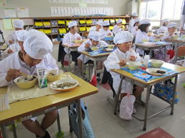 そして今日は1年生にとって、初めての小学校の給食。配膳では頼りになる6年生が手伝ってくれました。本日のメニューは黒糖パンとオムレツ、フレンチサラダ、チキンビーンズ、牛乳でした。1年生の子どもたちは、おいしそうに食べていました。これからもいっぱい食べて、元気な体づくりをしていきましょうね。