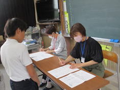 土曜日に市の総合防災訓練があり、子ども達も参加して地震を想定した避難訓練や避難所の設営を行いました。体育館に避難した子ども達は、縦割り班になり、段ボールベッドやシェルターテント、パーテーションを使ったロールマットなどを先生方や防災士の方、市の防災危機管理課の方と一緒に設営しました。子ども達は自分たちで組み立てたテントや段ボールベッド、ロールマットに寝転がり、感触を確かめていました。その後、無言でグラウンドに出て消防署の方の誘導による火災発生時の煙体験を全校児童で体験しました。口にハンカチを覆って、煙を吸わないようにしながら通路の中を低い姿勢で移動する子ども達。煙で前が見えなくなっていた通路から脱出すると、消防士さんから声をかけてもらって安心した表情を浮かべていました。