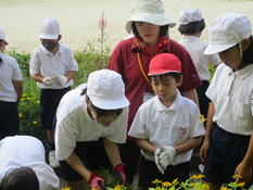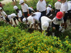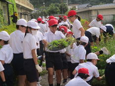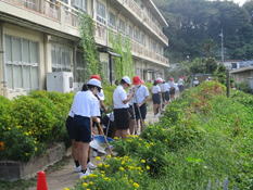 今日も朝からとても暑かったのですが、毎月1回のグリーンタイムを行いました。地域の方と全校児童、先生方で一斉に朝から草抜きを行い、三井小学校の花壇(フラワーロード)をきれいにしました。暑い中でしたが、子ども達もいっぱい草を抜き、とてもきれいになりました。その後、1年生は自分の鉢に咲いていたアサガオの種を取って、集めていました。 グリーンタイムでは残暑が厳しい中、お手伝いいただきました地域の方、ありがとうございました。  整理され、きれいなった花壇に新しい苗を植えて、花いっぱいの学校にしていきたいと思います。
