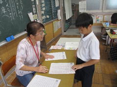 毎週木曜日の朝は、地域の方にお越しいただき、子ども達の計算ドリルの〇付けやアドバイスをされています。地域の方から「よくがんばりました」と励ましの声を掛けていただき、子ども達はうれしそうに微笑んでいました。