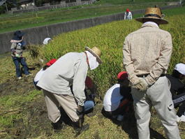 黄金色の稲穂に感動!!地域の方と稲刈りをしたよ!!(5年生)