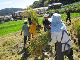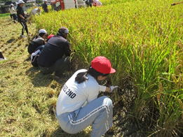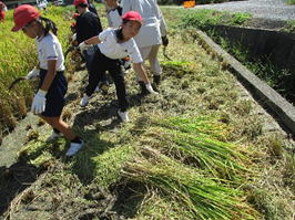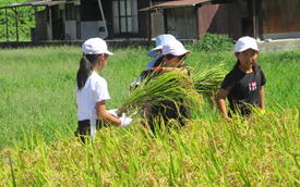 子ども達が地域の方からカマの使い方や上手な刈り方を教えてもらいながら稲刈りに挑戦!!稲刈りの大変さと収穫の喜びをいっぱい味わっていました。
